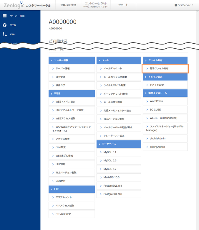Zenlogicカスタマーポータルにログインし、「コントロールパネル」メニューから対象のサービスを選択します。