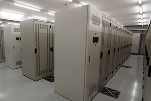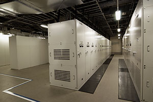 ビル給電は、信頼性の高い「3スポットネットワーク給電」。 各フロア1000KVAの容量をもつUPSを通じて各ラックに供給。 非常用電源として、緊急切替用バッテリーおよび備蓄燃料にて連続18時間運転可能なガスタービン発電機を完備。